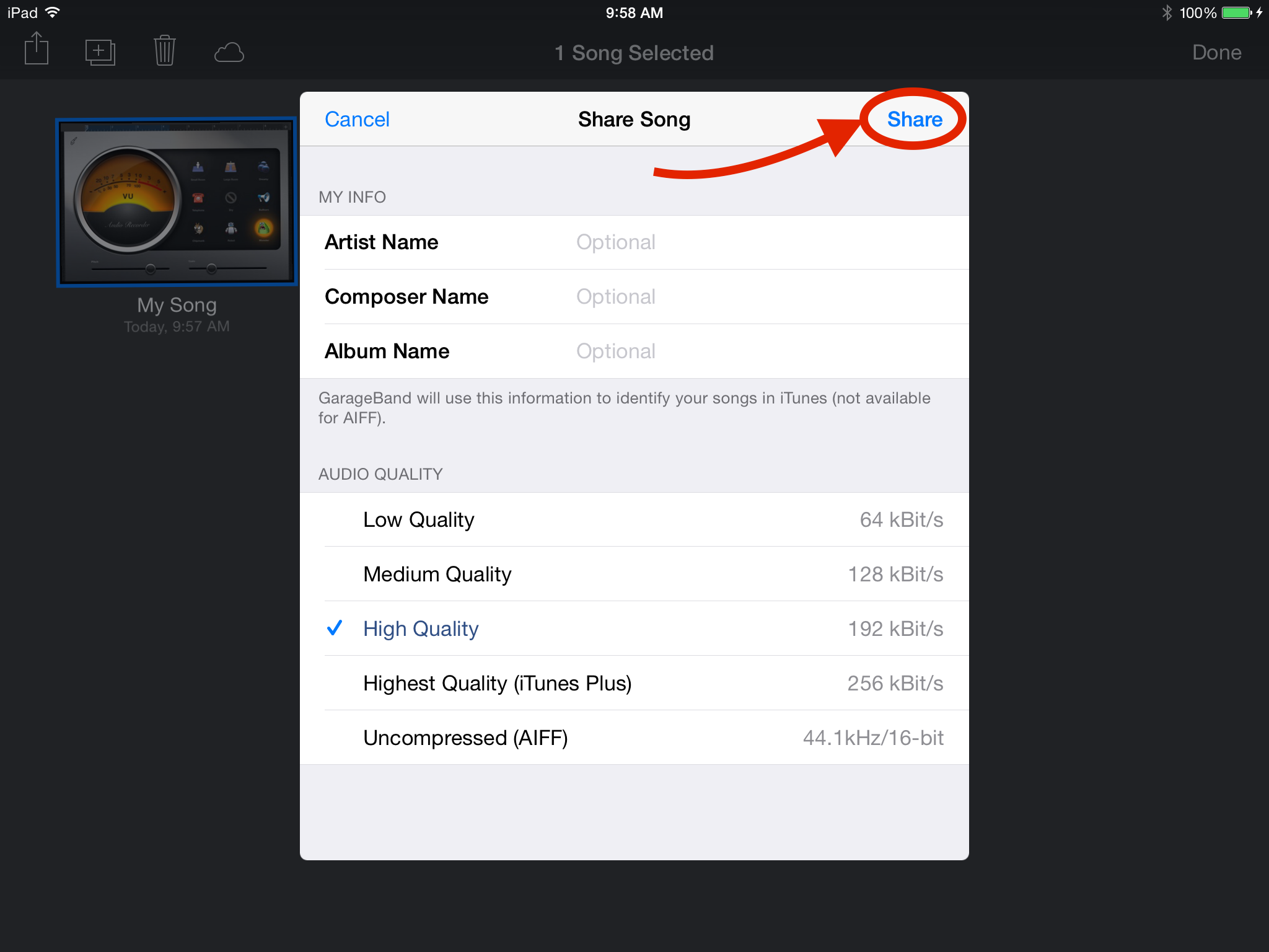 Now you can choose the settings for your song. Unless you need to change them to something specific, we recommend using the default settings. Once set, tap Share: